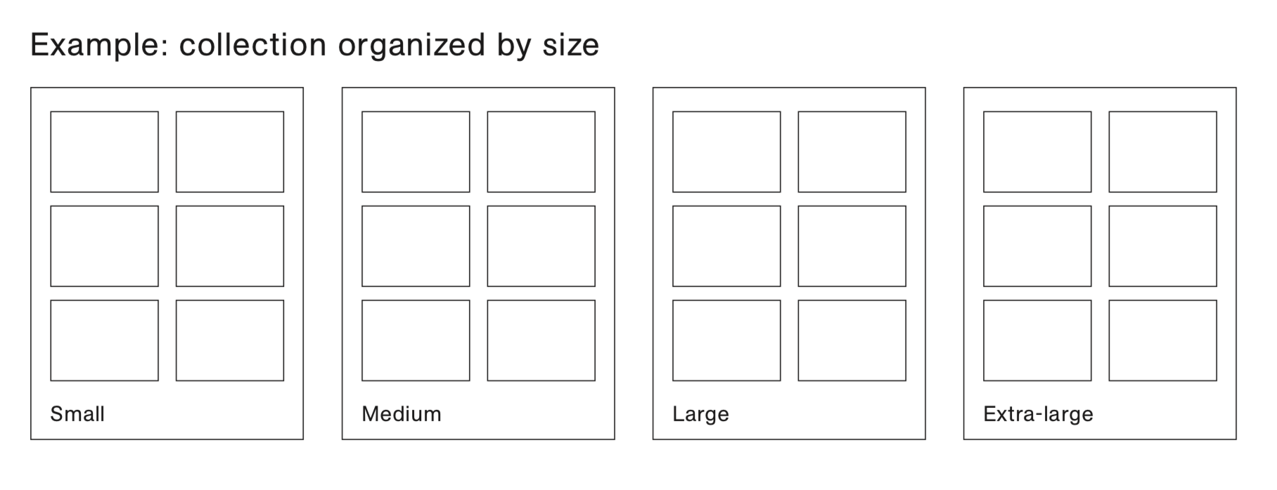 Along with organizing you must also name your categories. Your name gives you an opportunity to further define how your collection will be viewed. For example, ’S-M-L-XL’ for a collection organized by scale.