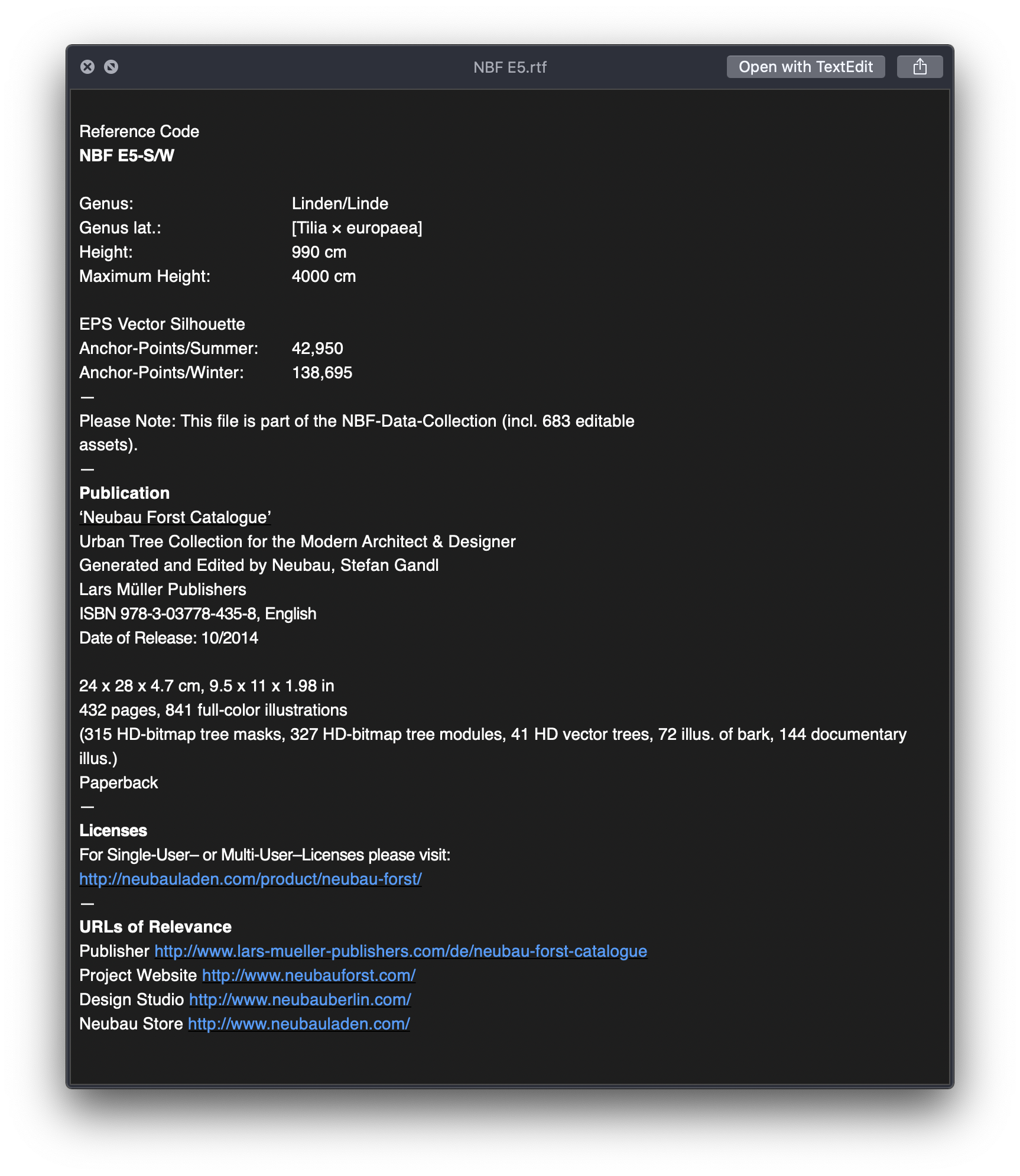 Neubau Forst Catalogue is the 432-page print catalogue of a digital collection of tree silhouettes and sculptures seen at different seasons. Working by hand, the Neubau designers digitally removed the trees from their original Berlin surroundings and thereby crafted a body of visual material whose scope, outstanding quality of detail and excellent image resolution sets it clearly apart from conventional tree libraries compiled with autotracing tools. The trees, which were systematically photographed in summer and winter over several years, assume a timeless validity through Neubau’s process of selection and are thus universally applicable for future visualizations.