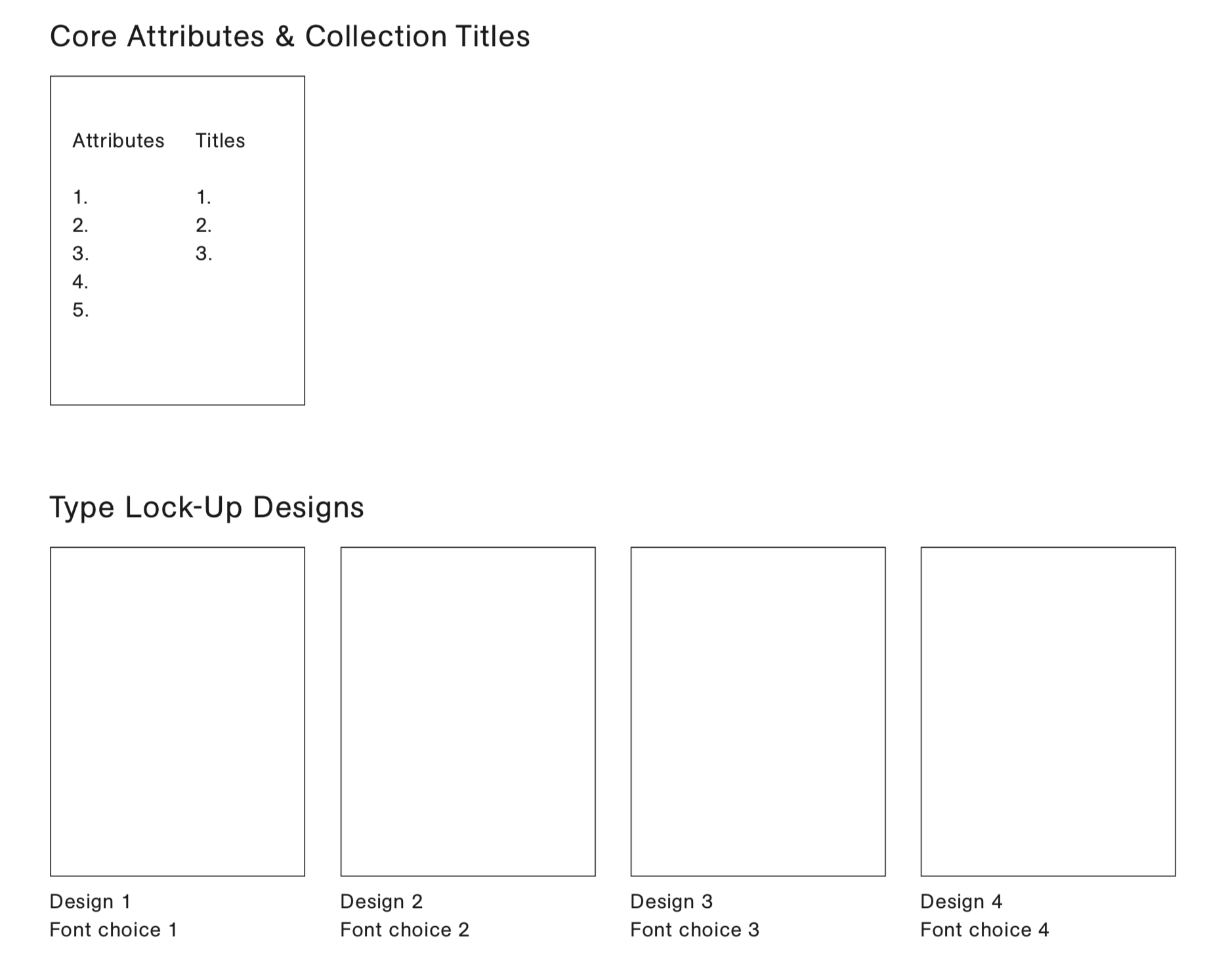 Print your 5 core attributes and 3 collection titles in two separate lists on a sheet of letter-sized paper. Print your 4 type lock-up designs on letter-size paper, 1 per page, listing the name of each typeface used at the bottom.