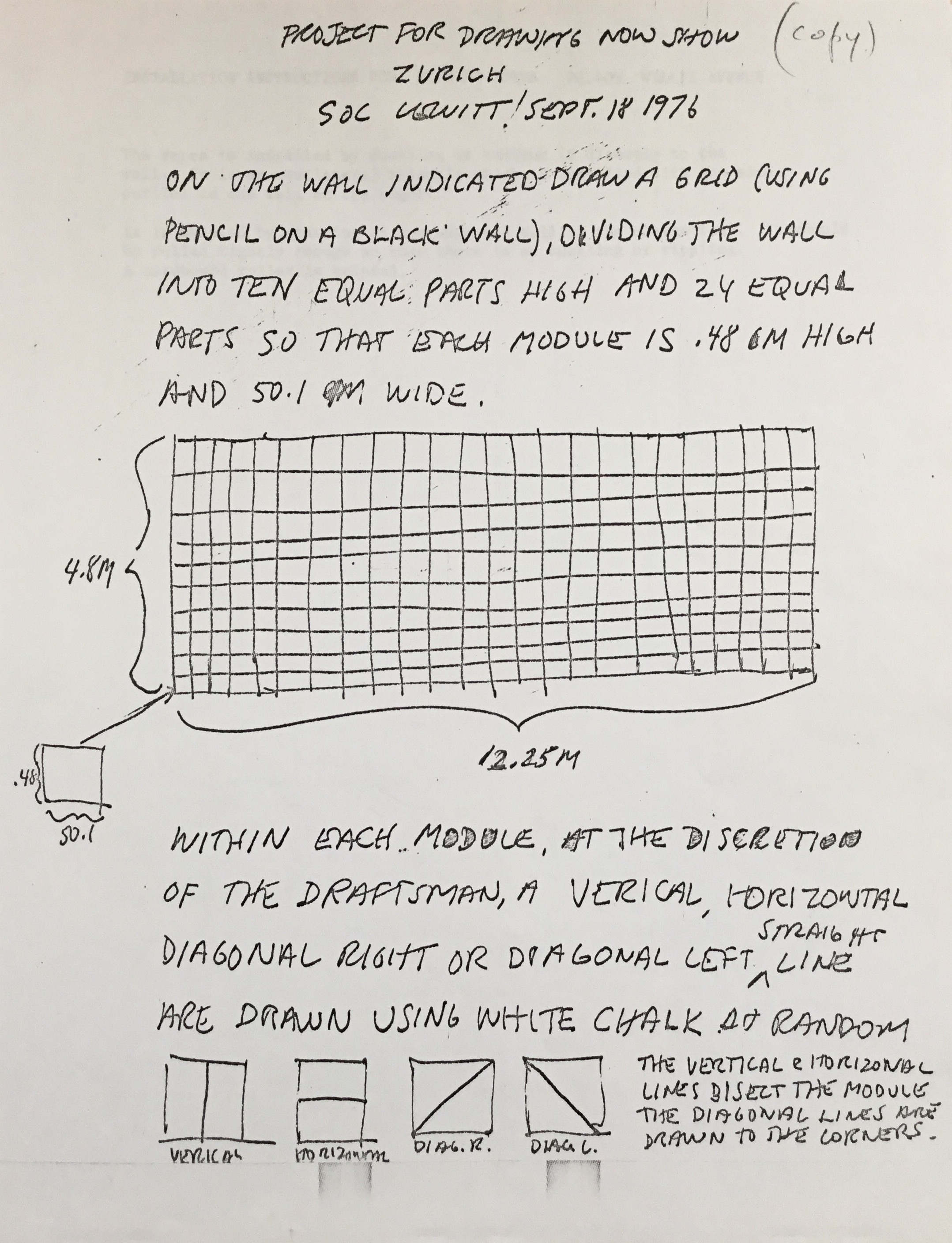 In 1968, LeWitt began to conceive sets of guidelines or simple diagrams for his two-dimensional works drawn directly on the wall, executed first in graphite, then in crayon, later in colored pencil and finally in chromatically rich washes of India ink, bright acrylic paint, and other materials. According to the principle of his work, LeWitt's wall drawings are usually executed by people other than the artist himself. Even after his death, people are still making these drawings. He would therefore eventually use teams of assistants to create such works. Writing about making wall drawings, LeWitt himself observed in 1971 that "each person draws a line differently and each person understands words differently". Source.