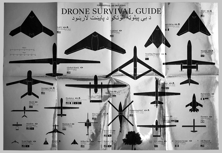 "I created a document that shows the silhouettes of the 27 best known military drones, all to scale, and lists the countries that use them. It also lists a series of countermeasures to avoid detection by the drones’ sensors, and how to disrupt them. Designed as a folded document, it can be carried around at all times. Printed on metallic coated paper, the front side can be used to reflect sunlight and blind the drones’ camera, one of the countermeasures listed. The document can be downloaded, printed and distributed by anyone for free. Originally published in English and Pashto, people are invited to create new translations of the countermeasures, which are posted online. Currently 32 languages are available. The Drone Survival Guide is not useful for survival, for anti-drone warfare, nor is it an act of propaganda. It is made with the sole purpose of sharing information about a phenomenon that is quickly changing warfare, and which many do not yet fully comprehend. The Drone Survival Guide is a citizen initiative, self-funded and made with public information, to balance the information provided by actors with a political or commercial agenda." Read Ruben’s research and process here.